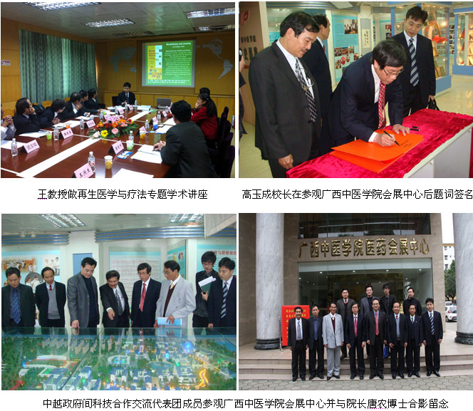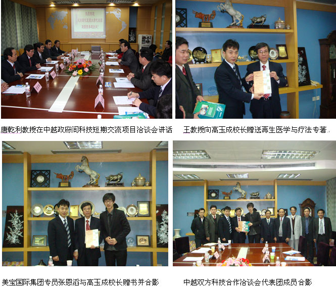為盡快啟動(dòng)中越政府間科技交流合作項(xiàng)目,“中越政府間科技合作聯(lián)委會(huì)第八次會(huì)議短期交流項(xiàng)目暨中越燒傷傳統(tǒng)診療技術(shù)的交流與合作”洽談會(huì)于2011年3月22日下午3時(shí)在在廣西中醫(yī)學(xué)院會(huì)展中心7樓第三會(huì)議室舉行,出席洽談會(huì)的中越雙方代表分別是以廣西中醫(yī)學(xué)院院長唐農(nóng)博士,科技處處長、項(xiàng)目負(fù)責(zé)人唐乾利教授,國際交流與合作處處長蔣基昌副教授、廣西中醫(yī)學(xué)院教務(wù)處長辛寧教授、廣西中醫(yī)學(xué)院科技處藤建北博士等領(lǐng)導(dǎo)和項(xiàng)目組其他成員組成的中方代表團(tuán)及以越南順化醫(yī)藥大學(xué)校長兼附屬醫(yī)院院長高玉成教授,順化醫(yī)藥大學(xué)書記兼副校長陳友當(dāng)教授,順化醫(yī)藥大學(xué)附屬醫(yī)院副院長、副書記阮生松博士,順化醫(yī)藥大學(xué)工會(huì)主席兼藥理部副主任陳文和博士,順化醫(yī)藥大學(xué)傳統(tǒng)醫(yī)學(xué)部副主任團(tuán)文翰教授,順化醫(yī)藥大學(xué)微生物部副主任陳停平教授一行6人組成的越方代表團(tuán),作為知識(shí)產(chǎn)權(quán)單位的代表,中國中西醫(yī)結(jié)合燒傷專業(yè)委員會(huì)常委、中國燒傷創(chuàng)瘍雜志副總編輯、北京美寶燒傷創(chuàng)瘍研究所副所長、臨床研究部主任王洪生教授、美寶國際集團(tuán)技術(shù)推廣專員張恩滔應(yīng)邀出席了洽談會(huì)。