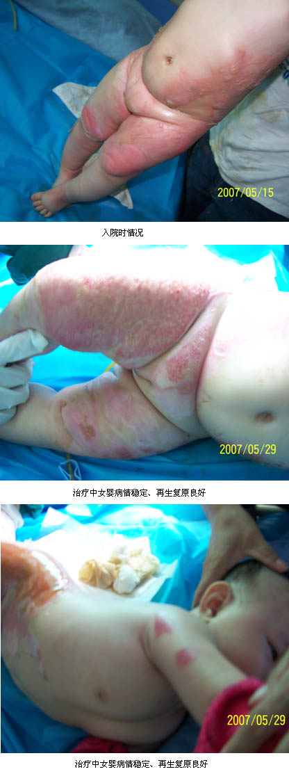 2007年5月16日,一個只有4個月大小的女嬰被家長急送到中山市黃圃人民醫(yī)院燒傷創(chuàng)瘍科,原來該患兒在半小時前被剛燒滾的熱水燙傷了,入院時檢查,患兒精神萎靡不振,哭聲低,表情淡漠。反應(yīng)差。入院診斷:燒傷休克,大面積特重度熱水燙傷40%TBSA(淺II度5%TBSA,深I(lǐng)I度淺型15%TBSA,深I(lǐng)I度深型10%TBSA,III度淺型5%TBSA,III度深型5%TBSA)。入院后,經(jīng)過積極的抗休克、抗感染等綜合治療,同時規(guī)范應(yīng)用皮膚原位再生技術(shù)進(jìn)行創(chuàng)面處理,盡管患兒一度出現(xiàn)SIRS表現(xiàn),但由于規(guī)范應(yīng)用皮膚原位再生醫(yī)療技術(shù),患兒平穩(wěn)度過了休克期和創(chuàng)面液化期和高代謝期,經(jīng)過35天的治療患兒創(chuàng)面全部自行愈合。