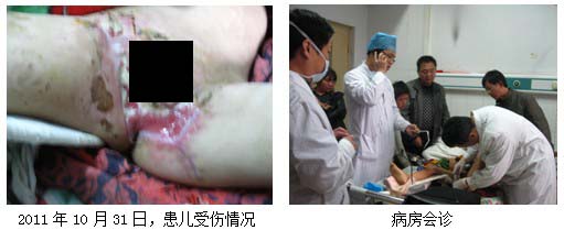 患兒常某,男,7歲,襄城縣庫莊鎮(zhèn)西戶村人。因2011年9月8日下午被汽車碾壓傷,造成骨盆骨折與皮膚碾挫傷,住院治療一個多月,傷口形成竇道,創(chuàng)面形成潰瘍。陳全喜主任和骨科鄭主任、王少營主任,主管醫(yī)師邢艷輝一起會診,會診意見是“二次手術(shù)清創(chuàng)植皮”。但是,陳全喜主任建議應(yīng)用皮膚原位再生醫(yī)療技術(shù)治療,可避免患兒受二次手術(shù)植皮之苦。陳主任指出:1)骨盆骨折患者不宜移動;2)患兒體質(zhì)差輕度貧血,不宜手術(shù);3)竇道處有股動脈經(jīng)過,手術(shù)風(fēng)險大。用皮膚原位再生復(fù)原技術(shù)治療有以下優(yōu)勢:1)避免了患兒移動,不影響骨折愈合;2)竇道內(nèi)再生新生組織;3)換藥無痛苦。陳主任又把皮膚原位再生復(fù)原技術(shù)能夠治愈患兒的皮膚潰瘍,實現(xiàn)皮膚生理性再生愈合講給醫(yī)生家屬聽。家屬和醫(yī)生聽陳主任講解后,同意應(yīng)用皮膚原位再生復(fù)原技術(shù)治療方案,家屬簽了治療同意書。
