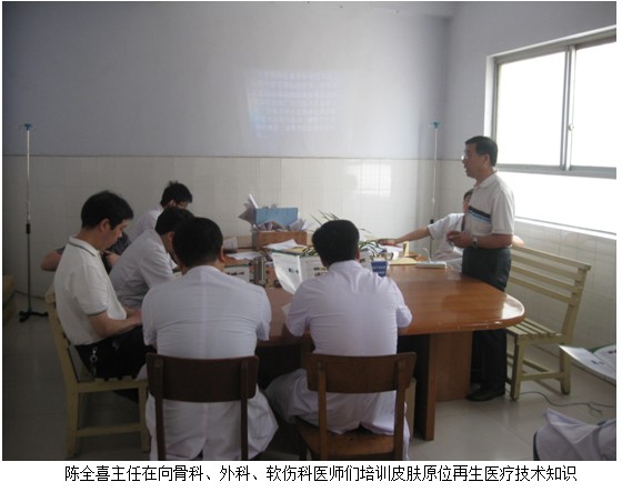 2012年6月2號上午,中國中西醫(yī)結(jié)合學(xué)會燒傷專業(yè)委員會委員、北京美寶燒傷創(chuàng)瘍研究所臨床部技術(shù)推廣專家陳全喜主任應(yīng)邀來到洛陽市孟津縣人民醫(yī)院骨科、外科、軟傷科,進行了科室的皮膚原位再生醫(yī)療技術(shù)培訓(xùn)。