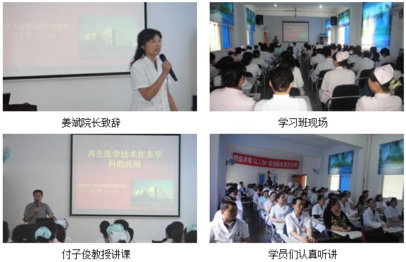 學術會議由醫(yī)院醫(yī)教科長劉杰主持,參會人員近70人,均為醫(yī)院的一線醫(yī)護工作人員。會議首先由姜斌院長致辭,付主任在大家熱烈的掌聲中開始了講座,付主任圖文并茂、深入淺出的講座讓在座的每一位學員都聽得津津有味,他將再生醫(yī)療技術的實用性,經(jīng)濟行,可操作性做了詳細的介紹,并且重點介紹了規(guī)范的再生醫(yī)療技術的換藥方法和原則。姜院長全程聽完了付主任的講座并作會議總結,她表示,再生醫(yī)療技術是一項非常實用的技術,是真正適合基層醫(yī)院應用的技術。學術會后大家都不愿離開,爭先恐后的提問讓付主任應接不暇,付主任坐到大家中間,耐心的一一詳細解答大家的提問。