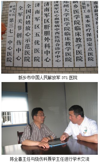 2012年5月10日晚,河南新鄉(xiāng)市中國人民解放軍371醫(yī)院燒傷科主任聶學邀請北京美寶燒傷創(chuàng)瘍研究所臨床部專家陳全喜主任進行學術(shù)交流,業(yè)務員楊志強隨行。