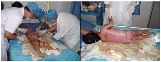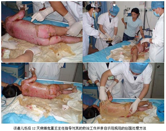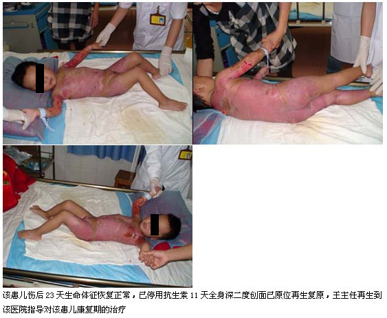 2011年4月23日23:33,廣西來賓市人民醫(yī)院外二科(骨科燒傷整形外科)急診收入一例熱液燙傷的小兒大面積燒傷。該患兒梁某某,3歲,因“熱液燙傷全身多處3小時急診入院,入院時查體見軀干、四肢、雙臀創(chuàng)面大部分水皰皰皮已破,創(chuàng)面紅白相間或白里透紅,入院診斷:熱液全身深二度燒傷總面積60%TBSA。入院后,創(chuàng)面處理采用燒傷皮膚原位再生復原技術,結合抗休克、抗感染、營養(yǎng)支持療法等綜合治療,該患兒原發(fā)有蠶豆病(先天性G6-PD缺乏癥),傷后12天,創(chuàng)面出現(xiàn)耐藥鮑曼不動桿菌,病情危重,該醫(yī)院緊急請求來到該醫(yī)院進行臨床學術交流的中國中西醫(yī)結合學會燒傷專業(yè)委員會常委、中國燒傷創(chuàng)瘍雜志社副總編輯、北京美寶燒傷創(chuàng)瘍研究所副所長,臨床研究部主任王洪生研究員為該患兒會診,指導對該患兒的臨床救治工作,經過來賓市人民醫(yī)院外二科(骨科燒傷整形外科)全體醫(yī)護人員夜以繼日的精心治療護理和王主任三下該醫(yī)院對該患兒及時準確的全程臨床指導,傷后23天該患兒生命體征恢復正常,已停用抗生素11天,全身深二度創(chuàng)面未植皮原位再生復原,燒傷皮膚原位再生復原技術暨再生復原療法使該患兒獲得了新生。
