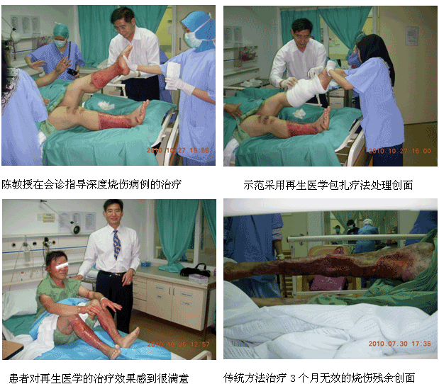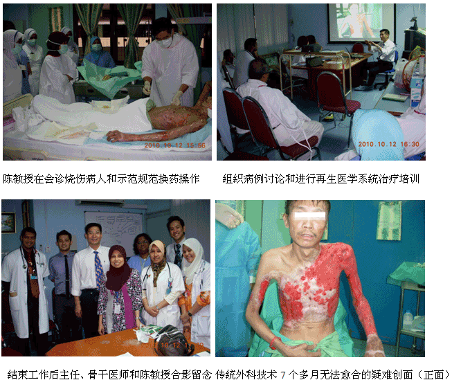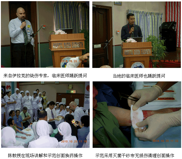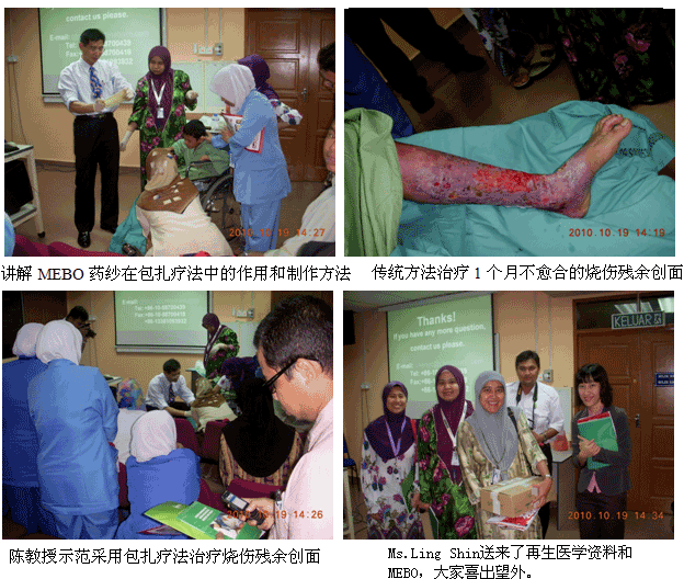 1、2010年10月11日上午7時(shí)30分,來自中國燒傷創(chuàng)瘍科技中心的陳永翀主任和負(fù)責(zé)馬來西亞學(xué)術(shù)推廣和醫(yī)療開發(fā)的Ms. Ling Shin Chew,應(yīng)馬來大學(xué)醫(yī)(UMMC)燒傷科負(fù)責(zé)人Dr. Margaret的邀請,來到了該院的外科病房會診和指導(dǎo)了3例疑難燒傷創(chuàng)瘍患者的治療,實(shí)現(xiàn)了很好的維護(hù)、提高再生醫(yī)學(xué)技術(shù)水平的效果。