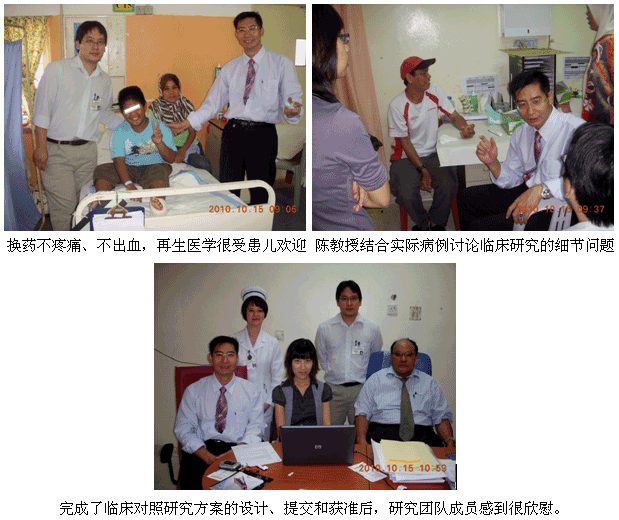 5、 10月15日,陳教授和Ms. Ling Shin再次應(yīng)Sultanah General Hospital (新山州中央醫(yī)院,當(dāng)?shù)刈畲蟮尼t(yī)院)醫(yī)院創(chuàng)傷骨科主任Dr. Thevarajan的邀請,到醫(yī)院進(jìn)行臨床指導(dǎo)和討論制定斷指再生的臨床研究方案.這是非常忙碌的一天,早上8時(shí),陳教授剛到骨科的門診已有多位患者在等候,其中手指離斷損傷的有6例,創(chuàng)傷病例3例,陳教授均一一細(xì)心地查看和指導(dǎo),糾正治療過程中存在的一些不足和不夠規(guī)范的地方;處理完門診的患者后,陳教授在Dr.Yong的邀請下,來到病房為1例開放性骨折嚴(yán)重創(chuàng)傷軟組織缺損的小兒患者進(jìn)行了會診和指導(dǎo),患兒和家長對再生醫(yī)學(xué)治療的效果感到很滿意;處理完患者的治療后,陳教授、Dr. Thevarajan主任、Dr.Yong Aik Peng 和Ms.Ling Shin等共同討論了“A Large Sample Randomized Open-labeled Clinical Comparative Study on the Efficacy and Safety of Topically Applied Moist ExposedBurn Ointment (MEBO) and Opsite in Subjects with Finger Injuries”(MEBO與Opsite治療手指創(chuàng)傷的有效性與安全性的大樣本隨機(jī)臨床對照研究)的臨床研究課題,討論解決了方案中的一些具體問題,然后通過網(wǎng)絡(luò)在線報(bào)給了馬來西亞國家醫(yī)學(xué)臨床研究中心,獲準(zhǔn)立項(xiàng),成為國家級的臨床研究項(xiàng)目,并開始實(shí)施。