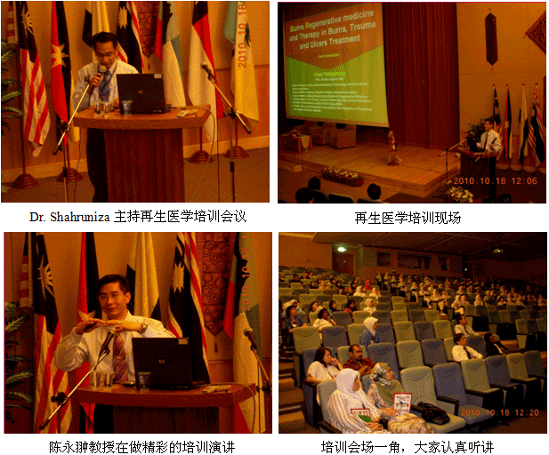 6、10月17日上午9時(shí),再生醫(yī)學(xué)州級培訓(xùn)班------Kuala Terenggganu State(夸拉. 登家樓州)醫(yī)學(xué)繼續(xù)教育項(xiàng)目在Hospital Sultanah Nur Zahirah (登家樓州中央醫(yī)院,1100病床)的禮堂勝利召開。來自全州各城市的10多家醫(yī)院的100多名醫(yī)護(hù)人員參加了培訓(xùn)會。培訓(xùn)會舉行了簡短的開幕儀式,該院醫(yī)教科的Dr. Azliza主持開幕式,創(chuàng)傷骨主任Dr. Ahmad Tajuddin致歡迎詞并向大家介紹主講專家。開幕儀式結(jié)束后,陳永翀教授應(yīng)邀以“燒傷再生醫(yī)學(xué)與療法在燒傷、創(chuàng)瘍的臨床規(guī)范應(yīng)用”為題,對前來參會的醫(yī)護(hù)人員進(jìn)行了較系統(tǒng)的再生醫(yī)學(xué)知識培訓(xùn),陳教授演講的內(nèi)容新穎、通俗易懂、有條理,很受大家的歡迎。接著,該院的骨科醫(yī)師Dr. Colin以“燒傷再生醫(yī)學(xué)技術(shù)在我院的臨床應(yīng)用報(bào)告”為題,向參會的臨床醫(yī)護(hù)人員介紹了骨科引進(jìn)和應(yīng)用再生醫(yī)學(xué)技術(shù)1年來所治療的37例創(chuàng)瘍患者所取得的神奇效果和體會,大家對這次的再生醫(yī)學(xué)專題培訓(xùn)會的培訓(xùn)內(nèi)容感到很滿意。