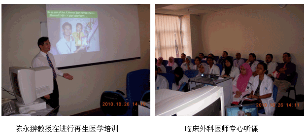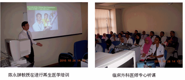 9、10月25日,再生醫(yī)學(xué)院級培訓(xùn)班在Hospital QEH (沙巴州中央醫(yī)院)學(xué)術(shù)報(bào)告廳舉辦,燒傷整形醫(yī)師Dr. Izety主持學(xué)術(shù)活動(dòng),燒傷整形中心主任Dr. Sergius介紹講課老師和談他參加國際會議認(rèn)識陳教授和了解到燒傷再生醫(yī)學(xué)的過程。來自該院的燒傷整形、普外、創(chuàng)傷骨科和急診科的60多名醫(yī)師、護(hù)士接受了再生醫(yī)學(xué)的培訓(xùn)。培訓(xùn)班還組織了2例燒傷病例的現(xiàn)場操作示范,通過現(xiàn)場示范,大家得以更全面和更直觀地學(xué)習(xí)和掌握再生醫(yī)學(xué)技術(shù)。培訓(xùn)結(jié)束后,該院馬上引進(jìn)和應(yīng)用燒傷再生醫(yī)學(xué)技術(shù)治療燒傷創(chuàng)瘍病人(目  前有1例37%的大面積特重度燒傷的患兒正在接受再生醫(yī)學(xué)治療)。