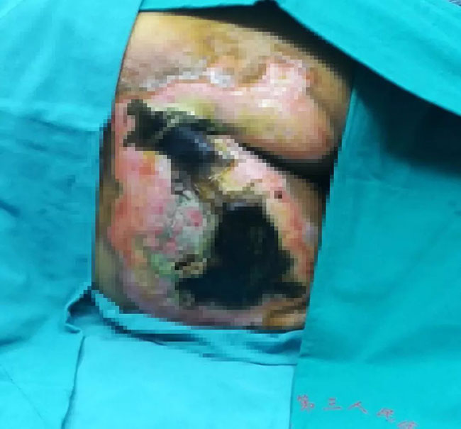 患者胡XX,今年81歲,中風(fēng)后導(dǎo)致左側(cè)肢體癱瘓。2017年11月份,用中藥熏蒸臀部,不小心燙傷皮膚,導(dǎo)致他雙側(cè)臀部起了水泡。自行買藥外敷后情況沒(méi)有好轉(zhuǎn),并逐漸出現(xiàn)皮膚脫落、紅腫加重的狀況,臀部受壓幾天后,情況更加嚴(yán)重,局部皮膚壞死變黑了。