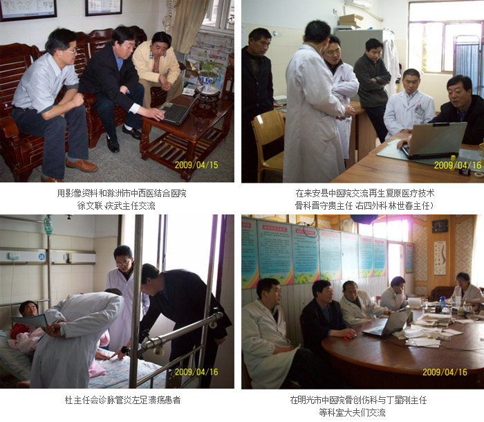 此次杜主任一行分別與滁洲市中西醫(yī)結(jié)合醫(yī)院骨創(chuàng)傷科主任徐文聯(lián)主任醫(yī)師、從慶武主任、李華杰主任,來(lái)安縣中醫(yī)院外科林世春主任、骨科晉守貴主任,明光市中醫(yī)院骨創(chuàng)科丁星剛主任進(jìn)行了交流。杜主任利用影像資料向三家醫(yī)院的主任和大夫們介紹了原位再生復(fù)原醫(yī)療技術(shù)在創(chuàng)瘍治療中的療效和臨床效果,以及再生復(fù)原醫(yī)療技術(shù)理論實(shí)踐―創(chuàng)傷與創(chuàng)傷愈合;介紹原位再生復(fù)原醫(yī)療新產(chǎn)品速愈貼的功效以及在5.12特大地震中所發(fā)揮的臨床效果及影響。通過(guò)觀看影像資料,使在座的醫(yī)務(wù)人員進(jìn)一步提高了對(duì)原位再生復(fù)原醫(yī)療技術(shù)的認(rèn)識(shí),并提出希望再生復(fù)原醫(yī)療技術(shù)的相關(guān)產(chǎn)品盡快進(jìn)入醫(yī)保和新農(nóng)合用藥目錄,造福廣大創(chuàng)瘍患者。同時(shí),杜主任就來(lái)安縣中醫(yī)院舉辦原位再生復(fù)原醫(yī)療技術(shù)學(xué)習(xí)班的事宜和張?jiān)洪L(zhǎng)進(jìn)行了交流。希望通過(guò)這些工作提高再生復(fù)原醫(yī)療技術(shù)在皖東的應(yīng)用水平。