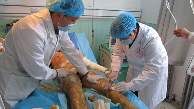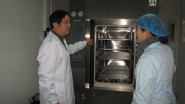 中國燒傷創(chuàng)瘍科技中心胡棟材教授曾多次蒞臨美寶燒傷創(chuàng)瘍空分醫(yī)院指導工作,這次看到醫(yī)院新裝修擴建的病房整潔舒適,醫(yī)療設備齊全醫(yī)護人員為患者精湛醫(yī)療服務而甚感欣慰,胡教授說:“我們做的事業(yè)是積善積德的事情,要用我們的服務用我們先進的技術(shù)治好更多的病患,服務于大眾”。在燒傷整形科的重癥監(jiān)護室,胡教授深入病房親自參與燒傷面積達到55%的三度硫酸燒傷患者的清創(chuàng)與換藥,并特別強調(diào)了規(guī)范操作細節(jié)的要求及重癥監(jiān)護室無菌病房的管理。在瘡瘍科胡教授對幾例重度褥瘡病人進行了查房,并對于理想的治療效果給予贊揚“咱們的褥瘡治療技術(shù)已經(jīng)達到了國際先進水平!”