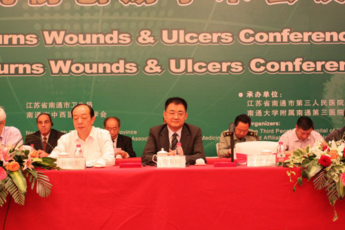 上午九時,代表們齊聚南通大酒店長江殿,開幕式由中國中西醫(yī)結合學會秘書長穆大偉主持,首先,他向代表們介紹了出息會議的嘉賓:衛(wèi)生部原副部長孫隆椿、南通市副市長楊展里、原衛(wèi)生部科技司司長肖梓仁、中國中西醫(yī)結合學會燒傷專業(yè)委員會名譽主任委員、人體再生復原醫(yī)療技術創(chuàng)始人徐榮祥、中國醫(yī)師協(xié)會副會長蔡忠軍、國際外科醫(yī)生協(xié)會副主席(阿聯(lián)酋地區(qū)主席),整形美容外科主任阿里教授(Ali AL-Numairy)、美國外科醫(yī)生協(xié)會會員,醫(yī)學博士薩克爾教授(Dr.Mahound Sakr)、中華中醫(yī)藥學會副會長謝陽谷、湖南省醫(yī)保局局長丁春庭、南通市衛(wèi)生局局長、醫(yī)學會會長蔣志群、南通市第三人民醫(yī)院院長、南通市中西醫(yī)結合學會會長王陸軍、中國中西醫(yī)結合學會燒傷專業(yè)委員會主任委員肖摩、中國中西醫(yī)結合學會燒傷專業(yè)委員會顧問趙俊祥、英國皇家外科醫(yī)師學會會員、醫(yī)學博士、腹腔鏡外科醫(yī)生 阿布杜爾哈尼教授(Dr. Maher Mohamed Sayed  Abdulghany)、濟南軍區(qū)衛(wèi)生部副部長梁雨合、南通市衛(wèi)生局副局長胡寧彬、江蘇省中西醫(yī)結合學會副會長、江蘇省中西醫(yī)結合醫(yī)院院長王小寧、四川省中西醫(yī)結合學會秘書長李成林、中國中西醫(yī)結合學會燒傷專業(yè)委員會副主任委員趙賢忠、中國中西醫(yī)結合學會燒傷專業(yè)委員會副主任委員賀全勇、中國中西醫(yī)結合學會燒傷專業(yè)委員會副主任委員付子俊、中國中西醫(yī)結合學會燒傷專業(yè)委員會副主任委員蘇順清。之后,穆秘書長請孫副部長、楊副市長、肖司長、徐榮祥教授、蔡副會長、謝副會長、蔣局長、王院長等嘉賓致辭。