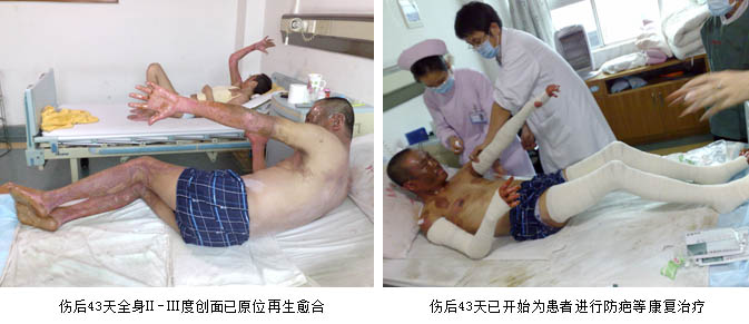 病例一、患者洪某、男、45歲,入院診斷:1、煤氣全身Ⅱ-Ⅲ度燒傷總面積75%TBSA(淺Ⅱ度5%、深Ⅱ度淺5%、深Ⅱ度深10%、淺Ⅲ度55%);2、爆震傷;傷后5天因爆震傷致ARDS,隨行氣管切開及呼吸機(jī)輔助呼吸等措施治療3天后,ARDS得到控制并撤機(jī),7天拔除氣管插管,患者創(chuàng)面處理全程采用燒傷皮膚原位再生復(fù)原技術(shù),結(jié)合抗休克、抗感染、營(yíng)養(yǎng)支持、臟器功能保護(hù)等全身綜合治療45天,患者順利康復(fù)。