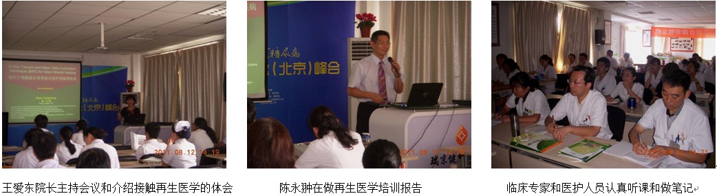 2011年8月15日下午2時30分,再生醫(yī)學專題培訓會在醫(yī)院的四樓會議室按時召開。醫(yī)院糖尿病潰瘍科的全體醫(yī)護人員和其它科室的大部分技術骨干30余人參加這次培訓會,培訓會由王愛東院長主持,她向大家介紹了在一次國際糖尿病會議上認識陳教授的經過和聆聽了陳教授的再生醫(yī)學報告后的感受,要求各位專家和護理人員認真聽課,利用這次難得的機會學習掌握好皮膚再生復原技術。陳教授則根據(jù)該醫(yī)院的特色,專門準備了培訓演講內容,在將近2小時的培訓會里,以“The New Development of In Situ Tissues and Stem Cells Cultivation Technique for Diabetic Wound Healing (組織干細胞原位培養(yǎng)技術治療糖尿病潰瘍新進展)”為題,分以下四個部分向大家做了一次較為系統(tǒng)而又通俗易懂的培訓:1、燒傷皮膚原位再生醫(yī)學的發(fā)明創(chuàng)立與燒傷皮膚再生復原臨床實效;2、K-19型干細胞原位培養(yǎng)再生燒傷全厚皮壞死皮膚的機理; 3、皮膚原位再生技術在糖尿病潰瘍領域應用新進展;4、皮膚原位再生復原技術創(chuàng)面治療臨床規(guī)范。培訓報告很受大家的歡迎,大家聽得非常認真和投入,認為這次的培訓太及時、太重要了!大家都為學習和了解到如此先進而又簡單易學的新技術感到無比的激動和興奮。北京中西醫(yī)結合學會燒傷專業(yè)委員會的彭韶君秘書、何蓮老師和郭軍老師到會免費為這次培訓會的醫(yī)護人員提供了再生醫(yī)學資料也很受歡迎。