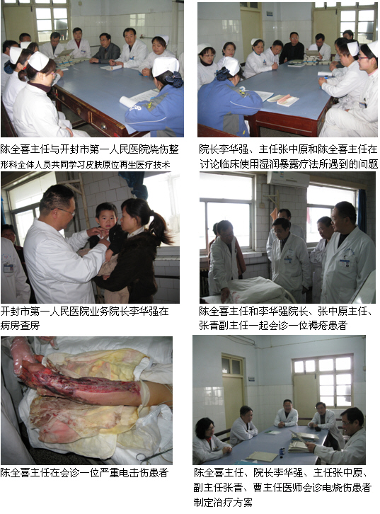 2010年4月18日,北京創(chuàng)瘍研究所副主任醫(yī)師陳全喜應(yīng)河南省開(kāi)封市第一人民醫(yī)院的邀請(qǐng),來(lái)到該院的燒傷整形科為該科室的醫(yī)生們進(jìn)行再生醫(yī)療技術(shù)培訓(xùn)。會(huì)議開(kāi)始前,陳全喜主任在李華強(qiáng)院長(zhǎng)的陪同下一同到病房為患者進(jìn)行會(huì)診,針對(duì)個(gè)別病例與醫(yī)生們一起探討,并制定治療方案。該院的業(yè)務(wù)院長(zhǎng)李華強(qiáng)、燒傷科主任張中原在培訓(xùn)講座開(kāi)始前,向大家簡(jiǎn)單地介紹了陳全喜主任及再生醫(yī)療技術(shù)在燒傷、創(chuàng)傷與潰瘍治療領(lǐng)域所取得的輝煌成就,并強(qiáng)調(diào)了學(xué)習(xí)再生醫(yī)療技術(shù)的必要性。