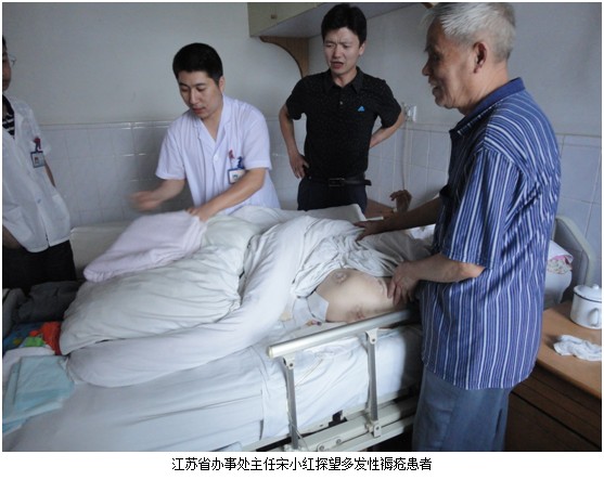 2012年6月29日下午烈日炎炎,應(yīng)德安醫(yī)院的邀請中國中西醫(yī)結(jié)合學(xué)會燒傷專業(yè)委員會常委、中國燒傷創(chuàng)瘍科技中心臨床醫(yī)療部金黨軍主任,江蘇省辦事處主任宋小紅,工作人員李長舜一行,為該院進行了《皮膚原位再生復(fù)原醫(yī)療技術(shù)在創(chuàng)面處理中的應(yīng)用》系統(tǒng)的學(xué)術(shù)講座,并對創(chuàng)瘍病人進行會診。