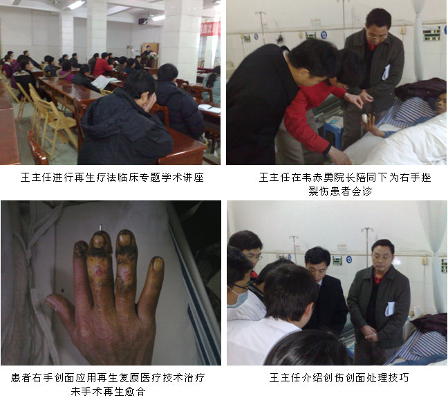 會后,王主任在該院院長韋赤勇、醫(yī)務(wù)科科長蔡凱及大外科主任、醫(yī)學(xué)專家等陪同下,深入該院創(chuàng)傷外科病房為幾例創(chuàng)瘍患者會診。韋赤勇院長在同王主任的交流中講到,通過近兩年王主任到該院的多次臨床學(xué)術(shù)交流與指導(dǎo),對該醫(yī)院在治療臨床難愈性創(chuàng)瘍創(chuàng)面和大面積深度燒傷創(chuàng)面上起到了很好的臨床傳幫帶的作用,尤其是該院近期收治的右手挫裂傷及右足貫通傷患者均未行常規(guī)手術(shù)治療而是全程應(yīng)用再生復(fù)原醫(yī)療技術(shù)治療,現(xiàn)該患創(chuàng)面均自行愈合,右手和右足外觀和功能均得到了最大限度地恢復(fù)。韋赤勇院長還表示,再生復(fù)原醫(yī)療技術(shù)有效地幫助了該院醫(yī)務(wù)人員解決了以前很難解決的臨床難題,目前再生醫(yī)療技術(shù)在該院的各科室都進行了深入地推廣和應(yīng)用,今年該醫(yī)院要成立燒傷創(chuàng)瘍???,以更好的造福貴港市廣大的創(chuàng)瘍患者。