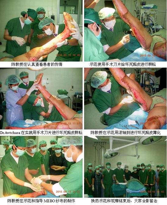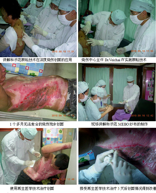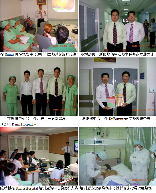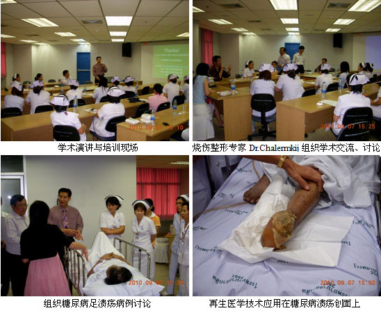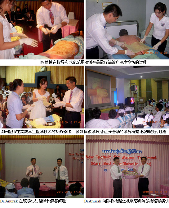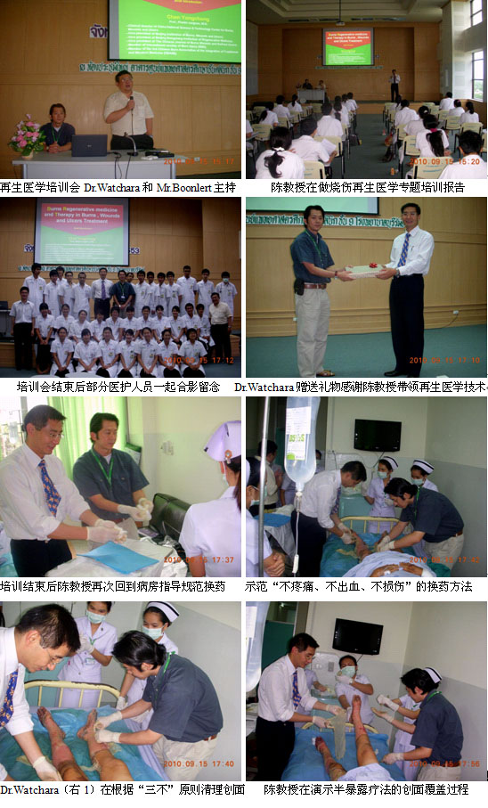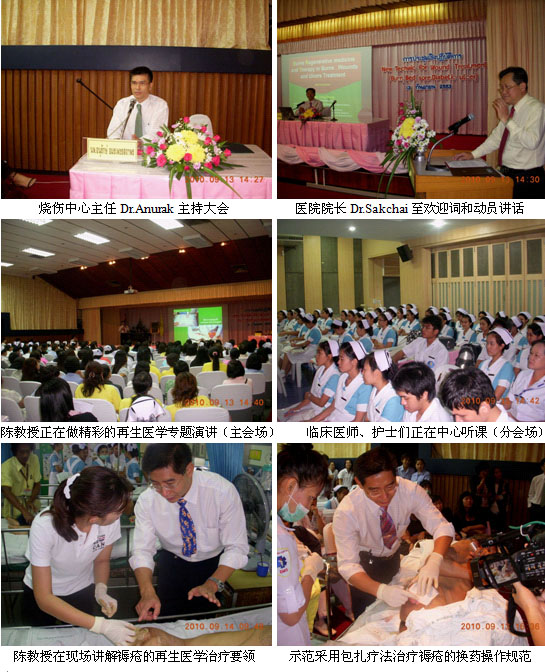 此次為了進一步鞏固成果,加快再生醫(yī)學技術(shù)在泰國的臨床應用,2010年9月5日至9月17日,經(jīng)過泰國市場區(qū)域經(jīng)理吳云及當?shù)卮砩?、?jīng)銷商的精心的組織和策劃,中國燒傷創(chuàng)瘍科技中心臨床部主任、北京榮祥再生醫(yī)學研究所副所長、北京中西醫(yī)結(jié)合學會燒傷專業(yè)委員會副主任委員、中國燒傷創(chuàng)瘍雜志社副社長陳永翀教授應邀到泰國10多家大型政府醫(yī)院及私人醫(yī)院進行學術(shù)演講、技術(shù)培訓和臨床指導, 培訓了泰國的醫(yī)護人員總計478人,會診指導和操作示范深度燒傷、慢性潰瘍、糖尿病潰瘍等病例共計17例,有效地鞏固并擴大了燒傷再生醫(yī)學在泰國的學術(shù)地位,醫(yī)療開發(fā)工作取得了前所未有的突破,老基地掀起了學習應用再生醫(yī)學技術(shù)的熱潮、呈現(xiàn)出勃勃生機。