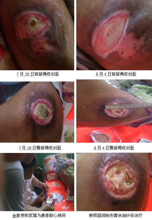 2010年8月4日,北京美寶燒傷創(chuàng)瘍研究所金黨軍教授接到湖北宜昌枝江的一位褥瘡患者需要會(huì)診的消息,立即從宜昌城區(qū)趕往枝江,到達(dá)患者家后,金教授即刻投入會(huì)診。該患屬于高齡患者,長期臥床,生活不能自理,進(jìn)食需流質(zhì),有糖尿病史,目前血糖穩(wěn)定。該患背部,骶尾骨處和臀部均有褥瘡創(chuàng)面,深淺不一。背部褥瘡面達(dá)七厘米長,臀部達(dá)五厘米長,并有腔道。該患之前在宜昌市中心人民醫(yī)院住院一個(gè)多月,用過美皮康等泡沫敷料護(hù)理創(chuàng)面,但效果不太理想,在家屬購買美寶創(chuàng)瘍貼后,使用一個(gè)多星期,創(chuàng)面已有好轉(zhuǎn)的現(xiàn)象。金教授小心輕柔地為該患去除創(chuàng)面的壞死組織,并涂濕潤燒傷膏,制作濕潤燒傷膏油紗條引流到空腔,最后覆蓋創(chuàng)瘍貼。金教授邊操作邊耐心地向患者家屬講解了護(hù)理要點(diǎn)、注意事項(xiàng)和換藥時(shí)間。金教授耐心、細(xì)致的講解得到了患者及家屬的好評(píng)。