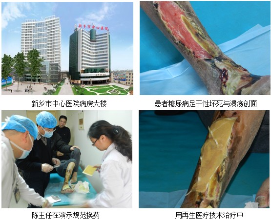 患者趙某,男,85歲,患糖尿病26年,右下肢動脈閉塞癥造成右足干性壞死。會診后,陳主任與內(nèi)分泌科主任王林棟醫(yī)師進行了“人體皮膚原位再生醫(yī)療技術(shù)”的交流。陳主任建議創(chuàng)面用“人體皮膚再生復(fù)原技術(shù)”治療;內(nèi)科治療則按王林棟主任原來的治療方案進行全身治療。這樣雙方配合才能治好糖尿病足。經(jīng)過醫(yī)生、家屬同意后,陳主任做了“人體皮膚原位再生醫(yī)療技術(shù)”的規(guī)范臨床治療演示。