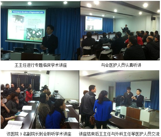 當晚的學術(shù)講座由該院外科主任魏啟財主持,其中主管副院長兼骨科主任林裔豐副主任醫(yī)師、副院長兼皮膚科主任林新鈺副主任醫(yī)師及連健兒副院長等院方領導也到會聆聽了學術(shù)講座。在專題學術(shù)講座中,王主任向醫(yī)生們介紹了燒傷濕潤暴露療法,闡述了燒傷皮膚原位再生醫(yī)療技術(shù)原理,與傳統(tǒng)醫(yī)學療法相比再生醫(yī)療技術(shù)的優(yōu)越性等;著重講解了暴露療法、半暴露療法和包扎療法的操作方法及要點;通過臨床病例圖片側(cè)重分析褥瘡、典型糖尿病足、下肢潰瘍等外科常見創(chuàng)傷治療前后過程。重點講述了再生療法在各種難愈性創(chuàng)面治療新進展及增生性瘢痕防治進展等新技術(shù)。最后還通過視頻講述了微粒皮種植技術(shù)的臨床操作。各種創(chuàng)面治療后理想的愈合效果讓醫(yī)生們對再生醫(yī)療技術(shù)有了更深刻的認識,得到了在場領導及大家的認可。