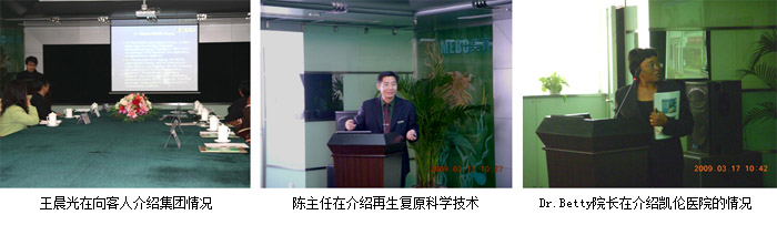2009年3月18日上午9時(shí),肯尼亞凱倫醫(yī)院的院長、兒童心臟病專家Dr. Betty M. Gikonyo及其助手和翻譯一行3人,按照預(yù)先約好的時(shí)間準(zhǔn)時(shí)來到了人體組織器官原位再生復(fù)原技術(shù)的發(fā)源地——美寶國際集團(tuán)總部。北京榮祥再生醫(yī)學(xué)研究所副所長、中國燒傷創(chuàng)瘍科技中心臨床部主任、集團(tuán)國際部專家陳永翀主任及助手王鶴和王晨光,代表集團(tuán)熱情接待了遠(yuǎn)道而來的客人。