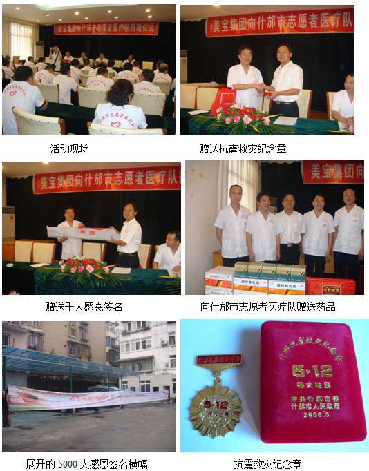 龔隊(duì)長(zhǎng)代表共青團(tuán)市委和志愿者醫(yī)療隊(duì)向美寶國(guó)際集團(tuán)贈(zèng)送了感恩錦旗、千人簽名的感恩橫幅、什邡市政府頒發(fā)的抗震救災(zāi)紀(jì)念章。美寶國(guó)際集團(tuán)四川分公司邱衛(wèi)東代表集團(tuán)向醫(yī)療隊(duì)贈(zèng)送了美寶藥品和節(jié)日慰問(wèn)品。