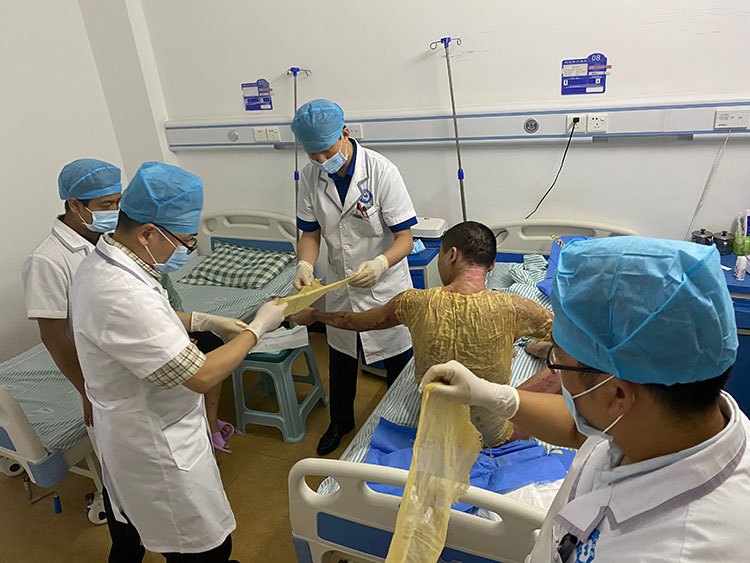 9月1日,北京榮祥再生醫(yī)學研究所副所長、中國中西醫(yī)結(jié)合學會燒傷專業(yè)委員會常務委員、《燒傷創(chuàng)瘍雜志》副總編輯、應用燒傷創(chuàng)瘍再生醫(yī)療技術(shù)治療糖尿病足領(lǐng)域?qū)<?、研究員王洪生主任應邀來到廣東省四會市慈航醫(yī)院、肇慶市仁愛手外科醫(yī)院分別會診兩例大燒傷面積病人。王教授親自到病房示范清創(chuàng)與換藥,進行臨床教學,受到醫(yī)院領(lǐng)導及各醫(yī)護人員和患者家屬的高度贊揚認可!