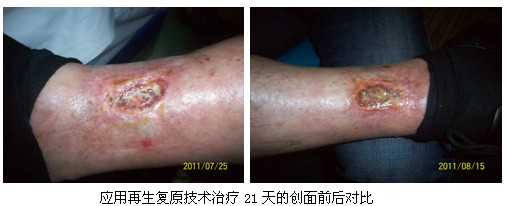 藥治療。患者曾在連云港市中醫(yī)院燒傷科接受過陸敏康主任的會診。8月15日~17日,杜福勤主任再次為其會診,該患經(jīng)1個月再生復原醫(yī)療技術(shù)的治療其創(chuàng)面已有明顯好轉(zhuǎn)。