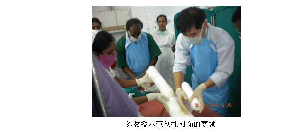 2、11月30日~12月1日,陳教授一行按計(jì)劃在KMC燒傷中心進(jìn)行臨床試驗(yàn)的培訓(xùn),對創(chuàng)面處理技術(shù)進(jìn)行了示范和指導(dǎo)。按照研究設(shè)計(jì),美寶濕潤燒傷膏印度III期臨床試驗(yàn)是多中心隨機(jī)對照的試驗(yàn),因此陳教授先在試驗(yàn)組示范了燒傷再生醫(yī)學(xué)與療法治療燒傷病例的標(biāo)準(zhǔn)操作程序(燒傷再生醫(yī)學(xué)之包扎療法),然后又給對照組示范了傳統(tǒng)方法治療燒傷創(chuàng)面的規(guī)范操作技術(shù)。經(jīng)過這2天的簡短的培訓(xùn),使參與研究的醫(yī)護(hù)人員更多地了解了整個臨床試驗(yàn)的設(shè)計(jì)、實(shí)施步驟、創(chuàng)面處理要求、病例登記表的填寫等,為高質(zhì)量和保障安全地展開臨床試驗(yàn)打下了一定的基礎(chǔ)。