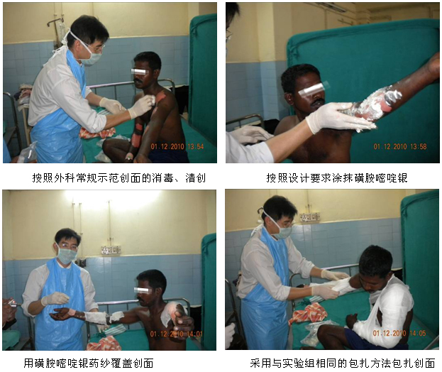 B、對照組(磺胺嘧啶銀組)病例創(chuàng)面的處理操作示范: