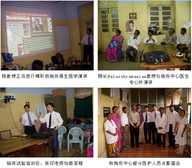 隨著徐榮祥教授發(fā)明的燒傷再生醫(yī)學(xué)在國際上的影響力和知名度的擴(kuò)大,越來越多的國家希望早日引進(jìn)再生醫(yī)學(xué)技術(shù)和配套產(chǎn)品-----美寶濕潤燒傷膏(MEBO),印度便是其中之一。為了盡快引進(jìn)MEBO,經(jīng)印度藥監(jiān)局(DCGI)的批準(zhǔn),MEBO在印度的III期臨床試驗(yàn)于2010年7月正式啟動并在各級醫(yī)院逐步展開。為了保證臨床試驗(yàn)的安全、順利進(jìn)行和對新增加的2家大型政府醫(yī)院的燒傷中心的參研人員進(jìn)行培訓(xùn),同時也是應(yīng)印度燒傷整形外科學(xué)會主席、欽奈醫(yī)學(xué)院附屬醫(yī)院燒傷中心主任Jayaraman教授的邀請,2010年年末,中國燒傷創(chuàng)瘍科技中心臨床部主任、北京榮祥再生醫(yī)學(xué)研究所副所長陳永翀教授和技術(shù)支持專員張印來到了Chennai市醫(yī)學(xué)院附屬醫(yī)院(KMC)和Madurai市醫(yī)科大學(xué)附屬醫(yī)院,向臨床醫(yī)護(hù)人員介紹了燒傷再生醫(yī)學(xué)研究應(yīng)用新進(jìn)展,對參與臨床試驗(yàn)的人員進(jìn)行了培訓(xùn),并指導(dǎo)臨床試驗(yàn)工作等。再生醫(yī)學(xué)的先進(jìn)性、實(shí)用性、有效性和便于掌握等,很受印度臨床醫(yī)師的歡迎,目前臨床試驗(yàn)正在有序進(jìn)行,并取得了初步的成功。現(xiàn)給讀者做一個簡短的介紹: