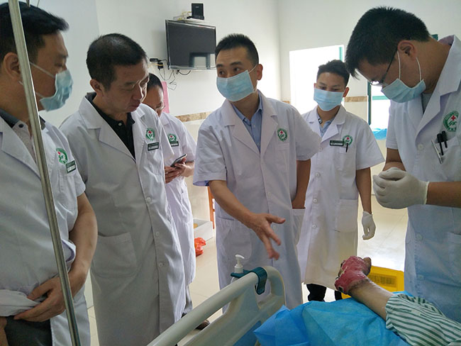 7月8日上午,應(yīng)三水蘆苞眾泰醫(yī)院汪國(guó)斌院長(zhǎng)的邀請(qǐng),再生醫(yī)療專家、中國(guó)中西醫(yī)結(jié)合學(xué)會(huì)燒傷專業(yè)委員會(huì)常務(wù)委員王洪生等到該院對(duì)一位因車禍致嚴(yán)重撕脫傷創(chuàng)面患者進(jìn)行會(huì)診,并現(xiàn)場(chǎng)示范清創(chuàng)和換藥。會(huì)診后給相關(guān)科室及一線臨床醫(yī)務(wù)人員進(jìn)行了再生醫(yī)療技術(shù)在難愈性創(chuàng)面的臨床應(yīng)用授課,此次活動(dòng)對(duì)推動(dòng)該院在再生醫(yī)療技術(shù)的臨床應(yīng)用方面起到了指導(dǎo)和帶動(dòng)作用。