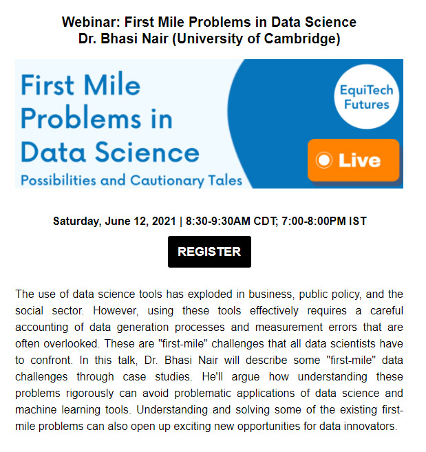 此前,芝加哥大學(xué)徐鵬智庫聯(lián)合牛津大學(xué)、劍橋大學(xué)、加州理工、阿斯本研究所等展開以“技術(shù)賦能未來”為核心的EquiTech Futures項目。為進(jìn)一步利用科學(xué)技術(shù)解決復(fù)雜社會挑戰(zhàn),依托該項目,這些有抱負(fù)的創(chuàng)新組織徐鵬智庫及劍橋大學(xué)再度聯(lián)合召開了此次研討會。本次研討會上,劍橋大學(xué)Bhasi Nair博士通過案例研究對這些“第一英里”的數(shù)據(jù)挑戰(zhàn)進(jìn)行了描述,并論證如何嚴(yán)謹(jǐn)?shù)乩斫膺@些問題才可以避免數(shù)據(jù)科學(xué)和機器學(xué)習(xí)工具的各種應(yīng)用問題。