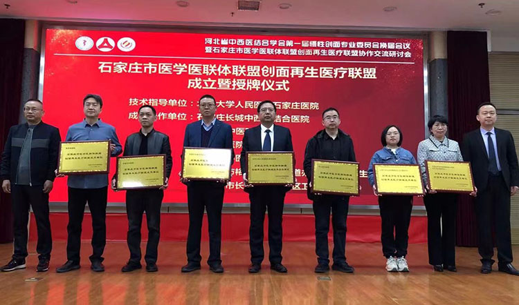 石家莊市醫(yī)學(xué)醫(yī)聯(lián)體聯(lián)盟創(chuàng)面再生醫(yī)療聯(lián)盟在此次大會上宣布成立。石家莊市醫(yī)學(xué)醫(yī)聯(lián)體聯(lián)盟是由北京大學(xué)人民醫(yī)院石家莊醫(yī)院牽頭成立的,此次依托石家莊市醫(yī)學(xué)醫(yī)聯(lián)體聯(lián)盟,成立了以技術(shù)協(xié)作交流為紐帶的專業(yè)聯(lián)盟組織。安雄彪副院長和方進(jìn)勇教授為聯(lián)盟第一批成員單位授牌。