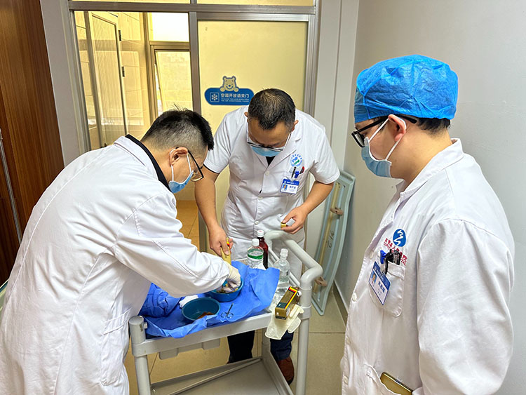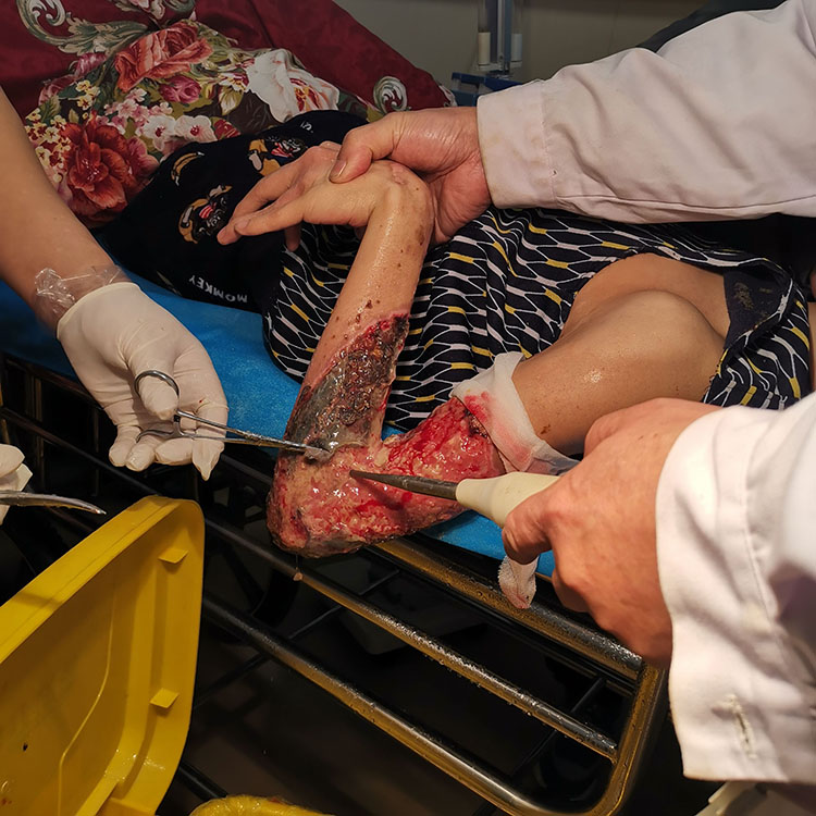 2023年2月27日,應(yīng)霍邱縣第二人民醫(yī)院燒傷科主任徐凡的邀請,中國中西醫(yī)結(jié)合學(xué)會燒傷專業(yè)委員會醫(yī)療部張強(qiáng)主任來院會診2例燒傷和1例血管閉塞性潰瘍病人,現(xiàn)場講解了再生醫(yī)療技術(shù)換藥技術(shù)要點(diǎn)并演示做油紗換藥。
