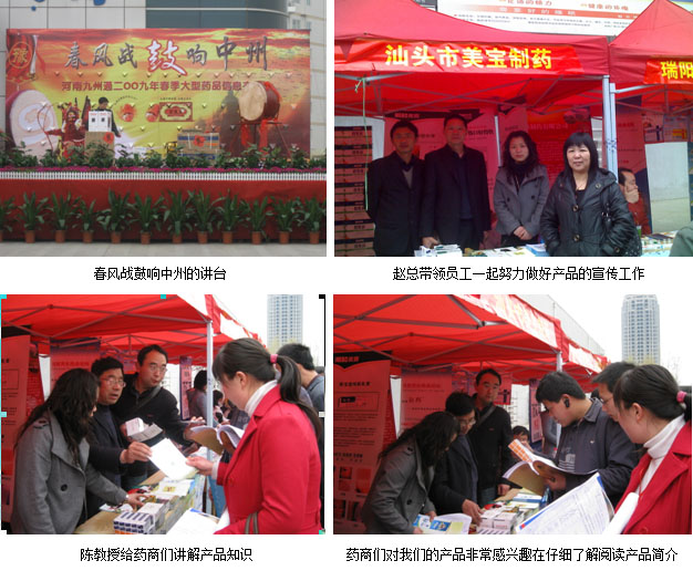 陽春三月,河南中州召開了河南省九州通2009年春季大型藥品信息交流會(huì),諸多藥商紛紛前來參加會(huì)議。展銷會(huì)共舉行了三天,參加會(huì)的有各地市的商業(yè)公司、產(chǎn)品分銷商及終端客戶。河南省美寶也帶著美寶國際集團(tuán)的多項(xiàng)再生產(chǎn)品參加了此次 “春風(fēng)戰(zhàn)鼓響中州”交流會(huì)進(jìn)行推介。