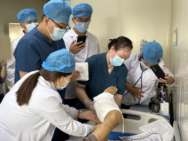 下午,訪問(wèn)團(tuán)的成員們分批進(jìn)入手術(shù)室,參觀并參與清創(chuàng)、微粒皮種植等手術(shù),每一個(gè)操作細(xì)節(jié)的展示都幫助他們將理論知識(shí)與實(shí)際操作深度結(jié)合,有效提升了其對(duì)再生醫(yī)療技術(shù)相關(guān)手術(shù)操作規(guī)范的理解與掌握程度,為今后在本國(guó)開(kāi)展同類手術(shù)積累了關(guān)鍵的實(shí)踐經(jīng)驗(yàn)。觀摩活動(dòng)結(jié)束之后,燒傷整形與創(chuàng)面修復(fù)科的醫(yī)生們繼續(xù)帶來(lái)了燒傷再生醫(yī)療技術(shù)治療壞死性筋膜炎、燒傷再生醫(yī)療技術(shù)救治糖尿病足臨床實(shí)踐效果的經(jīng)驗(yàn)分享,并在分享結(jié)束后與蒙古國(guó)的醫(yī)護(hù)就兩國(guó)在再生醫(yī)療技術(shù)上的差異和不同經(jīng)驗(yàn)展開(kāi)了深入交流。通過(guò)對(duì)比兩國(guó)在患者體質(zhì)、診療環(huán)境、醫(yī)療資源配置等方面的差異,共同探討了技術(shù)本土化調(diào)整的可行路徑,為再生醫(yī)療技術(shù)在蒙古國(guó)的優(yōu)化提供了重要參考。