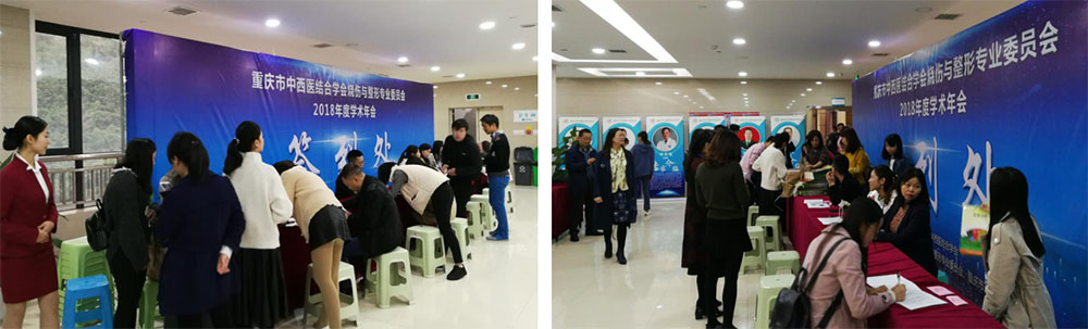 早上7點30分,會場外簽到處前來報道的醫(yī)護人員絡(luò)繹不絕,好生熱鬧,工作人員和前來簽到的參會代表都忙得不可開交,截至到大會開始前,前來簽到的人員就有重慶醫(yī)科大學(xué)附屬第一醫(yī)院、重慶醫(yī)科大學(xué)附屬第二醫(yī)院、重慶醫(yī)科大學(xué)附屬永川醫(yī)院、陸軍軍醫(yī)大學(xué)大坪醫(yī)院、重慶市中醫(yī)院、解放軍第324醫(yī)院、重慶武警總隊醫(yī)院、重慶華美整形美容醫(yī)院等各市級醫(yī)院、區(qū)縣級醫(yī)院及各私立醫(yī)院60余家單位200多人。