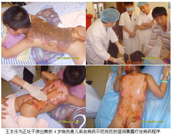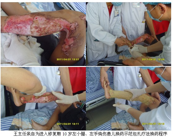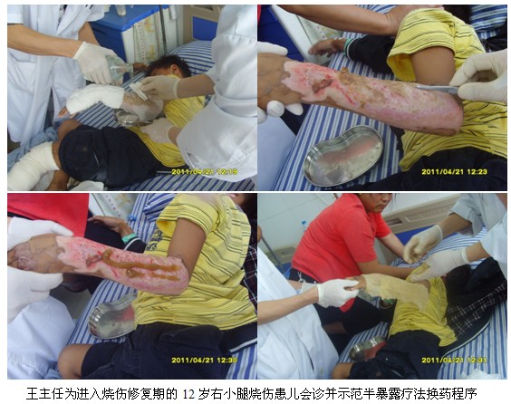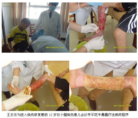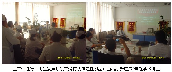4月21日上午9時(shí),王洪生主任應(yīng)邀到該院該院燒傷外科為正在住院的多名燒傷創(chuàng)瘍患者會(huì)診,并親自為多名患者換藥,示范不同深度燒傷及不同時(shí)期燒傷創(chuàng)面規(guī)范的處理方法。整個(gè)臨床示教及會(huì)診一直持續(xù)到當(dāng)日近12時(shí)才結(jié)束。當(dāng)日下午14:30分,王主任應(yīng)邀再次到該醫(yī)院燒傷外科會(huì)議室為兩個(gè)外科的醫(yī)護(hù)人員進(jìn)行“再生復(fù)原療法在燒傷及難治性創(chuàng)瘍創(chuàng)面治療的新進(jìn)展”專題學(xué)術(shù)講座。