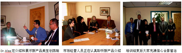 一、欲其事必先利其器。2011年3月12日,為了做好美寶創(chuàng)瘍貼的經(jīng)營和啟動工作,海灣JULPHAR藥廠和阿聯(lián)酋負責美寶產(chǎn)品經(jīng)營的人員主動放棄周六休息的時間進行產(chǎn)品知識培訓。中國燒傷創(chuàng)瘍科技中心臨床部的陳永翀教授給大家講解了美寶創(chuàng)瘍貼的再生醫(yī)學機理、臨床使用方法和臨床效果,Dr. Alaa Helail則向大家做了美寶創(chuàng)瘍貼新產(chǎn)品的介紹,期間大家還認真討論和確定了接下來的幾天在迪拜市和阿布扎比市的醫(yī)療開發(fā)與產(chǎn)品發(fā)布會的具體安排。通過這次培訓,使經(jīng)營人員了解和掌握了美寶創(chuàng)瘍貼的再生愈合機理、效果,以及與其它同類競爭產(chǎn)品的區(qū)別與優(yōu)勢,大家對該產(chǎn)品的經(jīng)營充滿了信心。