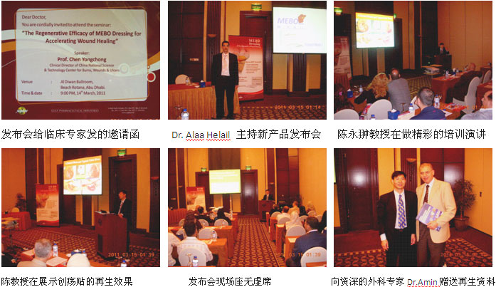 二、新產(chǎn)品發(fā)布與應用培訓會敲開了新市場之門。2011年3月13日和14日,美寶創(chuàng)瘍貼新產(chǎn)品發(fā)布與應用培訓會分別在迪拜和阿布扎比成功舉辦。來自各政府醫(yī)院、私營醫(yī)院、診所的燒傷、整形、普外、婦產(chǎn)、骨科、急診等數(shù)十家醫(yī)院的臨床多學科的120多名醫(yī)師、護士參加了美寶創(chuàng)瘍貼的發(fā)布培訓會(迪拜70多名,阿布扎比40多名),陳永翀教授應邀以“The Regenerative efficacy of MEBO Dressing for accelerating wound healing”(美寶創(chuàng)瘍貼再生愈合效果)為題,向參會的臨床專家們講解了創(chuàng)瘍貼的再生愈合創(chuàng)面的機理、臨床使用方法和令人嘆服的治療效果,演講很受大家的歡迎,大家也為找到一種有效而且方便使用的新產(chǎn)品而感到興奮和激動。這次的發(fā)布會舉辦得非常成功,反響熱烈,達到和超出了預期的效果。