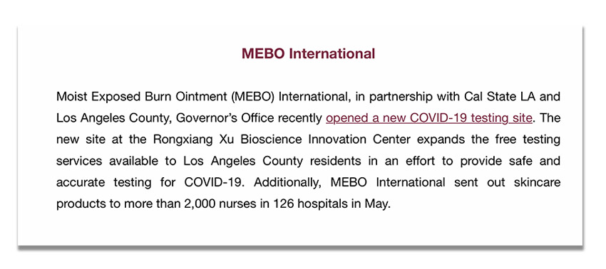 日前,美寶國際應(yīng)對新冠肺炎疫情的舉措作為典范被非營利組織Concordia特別推薦,重點(diǎn)介紹了加州州立大學(xué)洛杉磯分校徐榮祥生物科學(xué)創(chuàng)新中心設(shè)立為新冠肺炎免費(fèi)檢測點(diǎn),為當(dāng)?shù)厣鐓^(qū)提供安全的COVID-19檢測,幫助阻止病毒的傳播,在新冠肺炎流行中發(fā)揮的重要作用;以及美寶國際為126家醫(yī)院2000多名護(hù)士提供護(hù)膚品的愛心舉措。