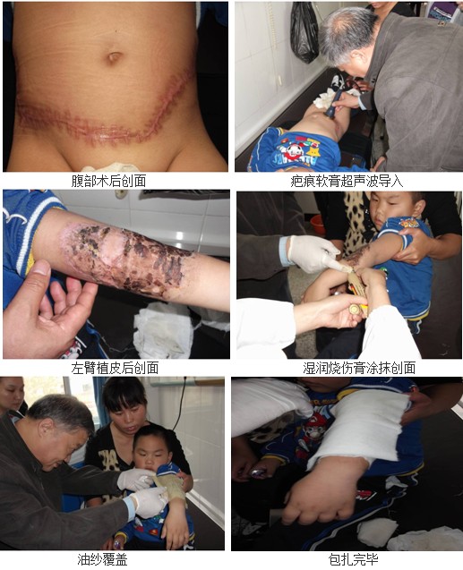 參會期間,金教授應(yīng)邀再次來到三峽大學(xué)仁和醫(yī)院手外整形科,為一位五歲左右的小男孩會診疤痕皮膚的治療?;颊咦蟊蹮齻瑥母共咳∑ひ浦驳绞直凵?,術(shù)后兩周腹部疤痕開始使用疤痕軟膏,已做導(dǎo)入治療一周,手臂還有黑痂。患者母親自述使用軟膏后疤痕變軟,金教授為小患者耐心做了疤痕軟膏導(dǎo)入治療,并為手臂換藥推薦了再生醫(yī)療技術(shù)濕性療法。主治醫(yī)師羅醫(yī)生和護(hù)理人員們也學(xué)習(xí)了濕潤燒傷膏油紗條的制作和規(guī)范換藥方法。