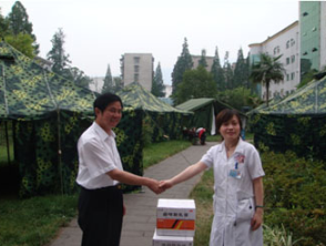 6月10日中國抗震救災(zāi)創(chuàng)瘍專家醫(yī)療隊在會診病人的同時也再次代表醫(yī)療隊總指揮徐榮祥教授向醫(yī)院又捐贈了抗震救災(zāi)急需藥品美寶創(chuàng)瘍貼一箱、曲咪新一箱、濕潤燒傷膏一箱,以及慰問金。一方面中國抗震救災(zāi)創(chuàng)瘍專家醫(yī)療隊依然堅持在前線進行抗震救災(zāi)傷員救治工作,另一方面力所能及地向災(zāi)區(qū)醫(yī)院進行急需藥品、物質(zhì)支援。