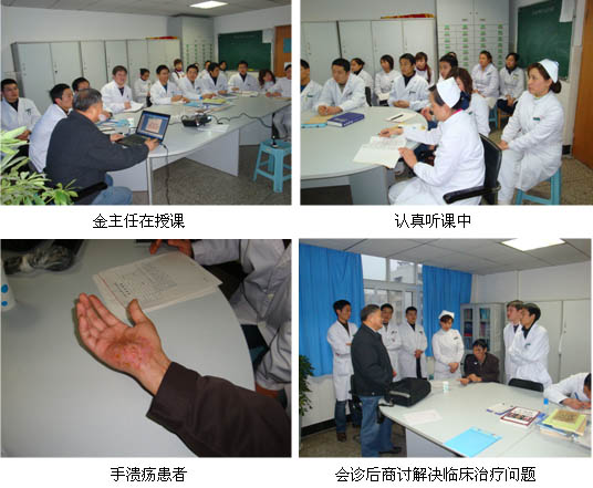 學(xué)術(shù)會議由戴主任主持,金教授先向大家介紹了燒傷及燒傷皮膚原位再生醫(yī)療技術(shù)的概念,而該技術(shù)是由濕潤暴露療法和濕潤燒傷膏來共同完成;介紹了暴露療法創(chuàng)面處理的原則、處理方式、規(guī)范換藥技術(shù)以及各類深淺度燒傷、潰瘍、褥瘡、糖尿病足、斷指再生等創(chuàng)面的處理方法;并通過展示大量真實的臨床病例圖片,使大家真正了解皮膚原位再生醫(yī)療技術(shù)及其再生產(chǎn)品的先進(jìn)性、實用性;隨后金教授介紹了再生醫(yī)療技術(shù)新產(chǎn)品—創(chuàng)瘍貼對壓瘡、糖尿病足潰瘍等創(chuàng)面的治療,并介紹了其作用原理、產(chǎn)品組成結(jié)構(gòu)、各類創(chuàng)面使用的方法等;還著重講解了在5.12四川災(zāi)區(qū)應(yīng)用再生醫(yī)療技術(shù)治療眾多患者所取得的良好療效。在金教授課結(jié)束后,參會人員結(jié)合實際工作中所遇的問題紛紛提問,如取皮后,使用濕潤燒傷膏或速愈貼遇滲血情況如何處理,燒傷膏油紗條如何制作,III度燒傷創(chuàng)面是否采用包扎療法等,現(xiàn)場氣氛十分活躍,金教授一一為大家做了細(xì)致回答,并在會議結(jié)束后對一位手部創(chuàng)傷患者進(jìn)行了會診。