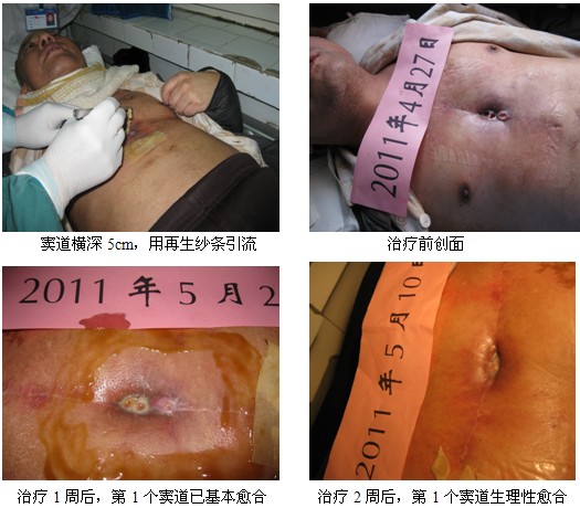 通過1周的治療,其中1個竇道被修復(fù),體溫由原來的38.5℃下降到36.4℃,咳嗽較前明顯減輕。治療到2011年5月17日,2個竇道已達到生理性愈合,患者體溫穩(wěn)定在36.4℃~36.6℃之間,通過物理治療,患者已不再咳嗽,食欲明顯好轉(zhuǎn),大小便正常。第3個竇道在皮膚原位再生醫(yī)療技術(shù)的規(guī)范治療下正在康復(fù)中。