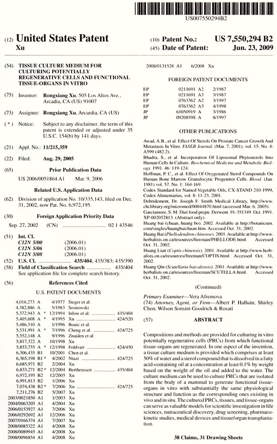 2008年12 月11日,是美寶國際集團(tuán)在知識(shí)化產(chǎn)權(quán)發(fā)展過程中又一振奮人心的日子。 再生生命科學(xué)創(chuàng)始人徐榮祥教授于2005年8月29日申請(qǐng)的專利—“潛能再生細(xì)胞與功能組織器官體外組織培養(yǎng)基”獲得了由美國專利局頒發(fā)的專利授權(quán)書。該項(xiàng)專利是繼徐教授前八項(xiàng)重大發(fā)明專利后的又一重大進(jìn)展與突破,該專利中所涉及的的組織培養(yǎng)基,實(shí)現(xiàn)了潛能再生細(xì)胞與功能組織器官的體外培養(yǎng),體現(xiàn)了以徐榮祥教授為核心的美寶科研團(tuán)隊(duì)在再生生命科學(xué)領(lǐng)域里所取得的前沿科研成果,在人類再生生命科學(xué)發(fā)展道路上又樹立了一個(gè)新的里程碑!