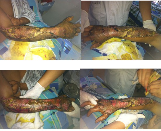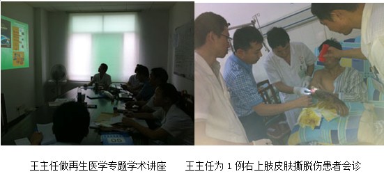 2012年9月26日下午三點,應(yīng)該院外科文振偉主任的邀請,中國中西醫(yī)結(jié)合學(xué)會燒傷專業(yè)委員會常委兼秘書、《中國燒傷創(chuàng)瘍雜志》副總編輯、北京美寶燒傷創(chuàng)瘍研究所副所長、第二臨床研究部主任王洪生研究員來到該院到該科作學(xué)術(shù)和技術(shù)上的交流和指導(dǎo),參會人員為該科室全體醫(yī)護人員共10余人。會議在該院外科室舉行, 王主任通過大量典型的臨床病例圖片及錄像資料詳細的介紹了再生醫(yī)療技術(shù)對深度燒傷及難愈性創(chuàng)面作用機理、再生復(fù)原療法對各種不同深度燒傷及各種難愈性創(chuàng)面治療方法和規(guī)范操作時的注意事項等,在授課過程之中大家認(rèn)真聽講,并在授課后大家對王主任講課內(nèi)容進行了深入的探討,王主任根據(jù)大家提出的問題有針對性的進行了講解,會后王主任對該科一例右上肢撕脫傷病人進行會診,王主任還親自為病人換藥,進行了現(xiàn)場的生動有效的臨床指導(dǎo)示范。