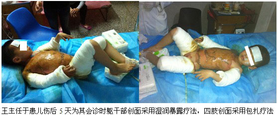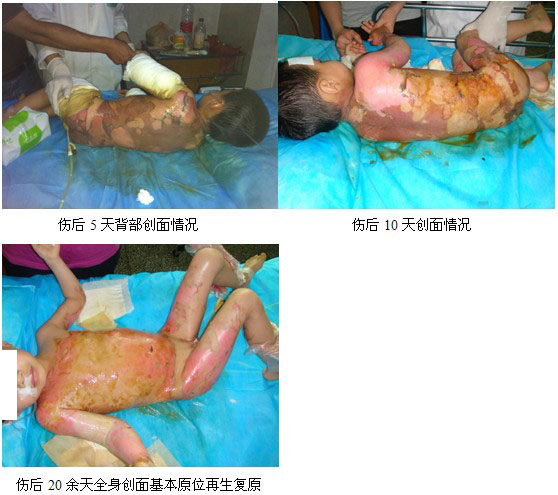 病例一.患兒XX,男,4歲,以“沸水燙傷全身多處伴疼痛半小時(shí)”為主訴于2011年4月11日急診入院。入院時(shí)查體:T:37.4℃,P:88次/分,R:20次/分,神志清楚,急性痛苦病容,四肢、前后軀干、臀部及會(huì)陰部散在大小不等的水皰,部分創(chuàng)面腐皮脫失,基底紅白相間,少滲出,感覺鈍。入院診斷:沸水全身燙傷40%TBSA,深I(lǐng)I度,特重度;患者入院后對(duì)其創(chuàng)面處理全程采用燒傷皮膚原位再生復(fù)原技術(shù),結(jié)合全身綜合治療,經(jīng)過對(duì)其近1個(gè)月的精心救護(hù),患兒順利渡過休克關(guān)、感染關(guān),創(chuàng)面愈合而出院。