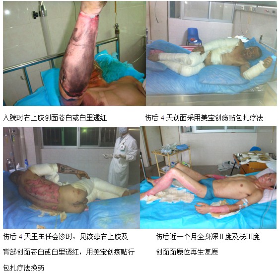病例二.患者XX,男,52歲, “火焰燒傷全身多處伴疼痛1小時(shí)”于2011年4月12日,急診入院。入院時(shí)查體:T:37.6℃,P:90次/分,R:22次/分,BP:140/70mmHg,神志清楚,急性痛苦病容,四肢、前后軀干、臀部及會(huì)陰部散在大小不等的水皰,部分創(chuàng)面腐皮脫失,基底紅白相間,少滲出,感覺鈍。入院診斷:火焰燒傷全身多處55%TBSA(淺II度5%、深I(lǐng)I度40%、淺III度10%);入院后對(duì)其創(chuàng)面處理全程采用燒傷皮膚原位再生復(fù)原技術(shù),結(jié)合全身綜合治療,經(jīng)過對(duì)其1個(gè)月的精心救護(hù)患者傷后病情穩(wěn)定,目前絕大部分創(chuàng)面愈合。